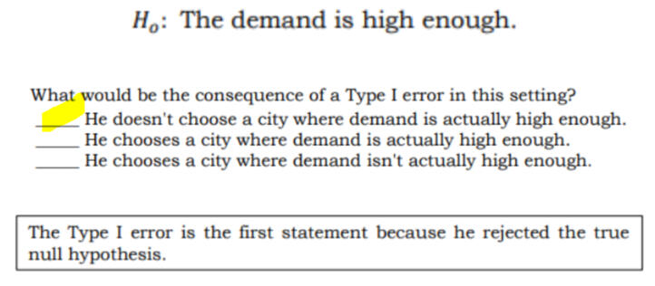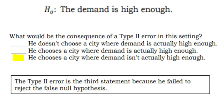 TYPE II ERROR = FAILED TO REJECT the null hypothesis when it is FALSE.You believed the hypothesis but it was wrong = Error: You chose a city where the demand is not actually high enough.